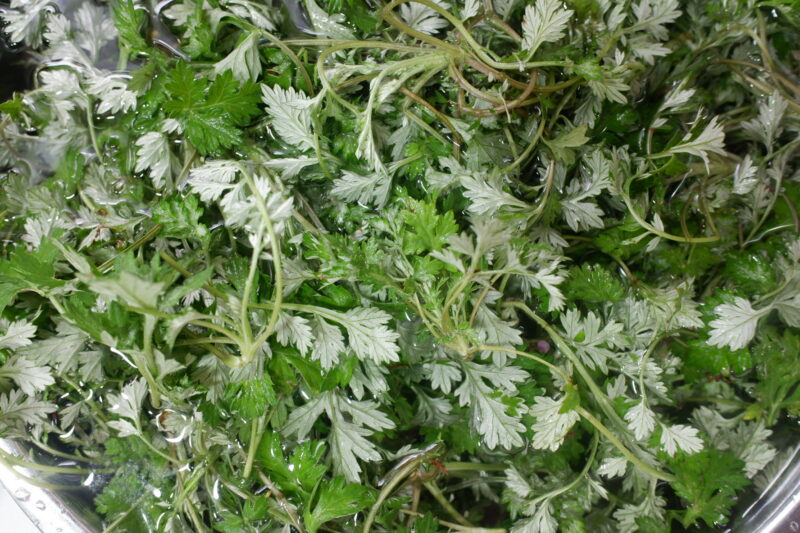 摘んできたよもぎは、洗ってゴミをとってから、沸騰したお湯に重曹こさじ1を入れて